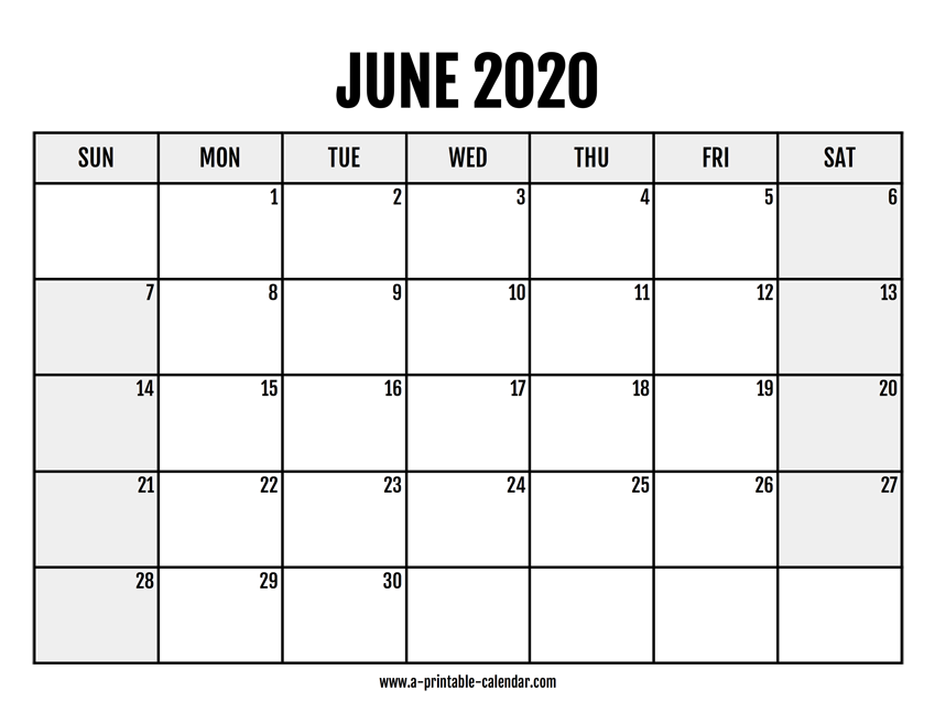 Download this 2020 June calendar in printable PDF format. The weekend is highlighted, which means Sunday and Saturday are easier to spot at a first glance. Paper size: US Letter. Dimensions: 8.5 x 11 inch. Orientation: landscape, horizontal.