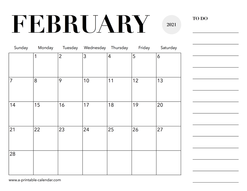 Download this 2021 calendar for February that comes with a handy to do list on the right side. You can also use that space for notes or to mark other events. Paper size: US Letter. Dimensions: 8.5 x 11 inch. Orientation: landscape, horizontal.