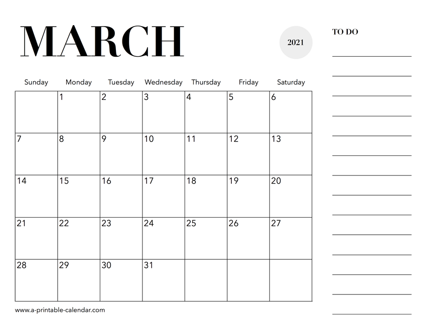 Download this 2021 calendar for March that comes with a handy to do list on the right side. You can also use that space for notes or to mark other events. Paper size: US Letter. Dimensions: 8.5 x 11 inch. Orientation: landscape, horizontal.