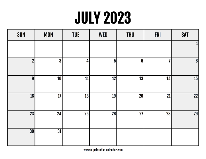 Download this 2023 July calendar in printable PDF format. The weekend is highlighted, which means Sunday and Saturday are easier to spot at a first glance. Paper size: US Letter. Dimensions: 8.5 x 11 inch. Orientation: landscape, horizontal.