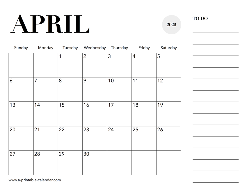 Download this 2025 calendar for April that comes with a handy to do list on the right side. You can also use that space for notes or to mark other events. Paper size: US Letter. Dimensions: 8.5 x 11 inch. Orientation: landscape, horizontal.