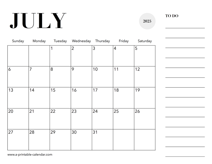 Download this 2025 calendar for July that comes with a handy to do list on the right side. You can also use that space for notes or to mark other events. Paper size: US Letter. Dimensions: 8.5 x 11 inch. Orientation: landscape, horizontal.