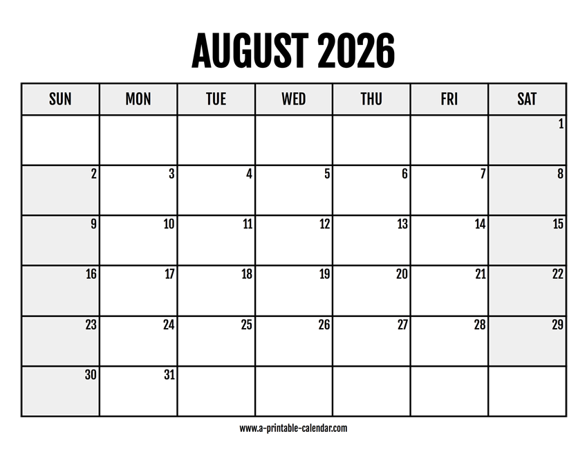 Download this 2026 August calendar in printable PDF format. The weekend is highlighted, which means Sunday and Saturday are easier to spot at a first glance. Paper size: US Letter. Dimensions: 8.5 x 11 inch. Orientation: landscape, horizontal.