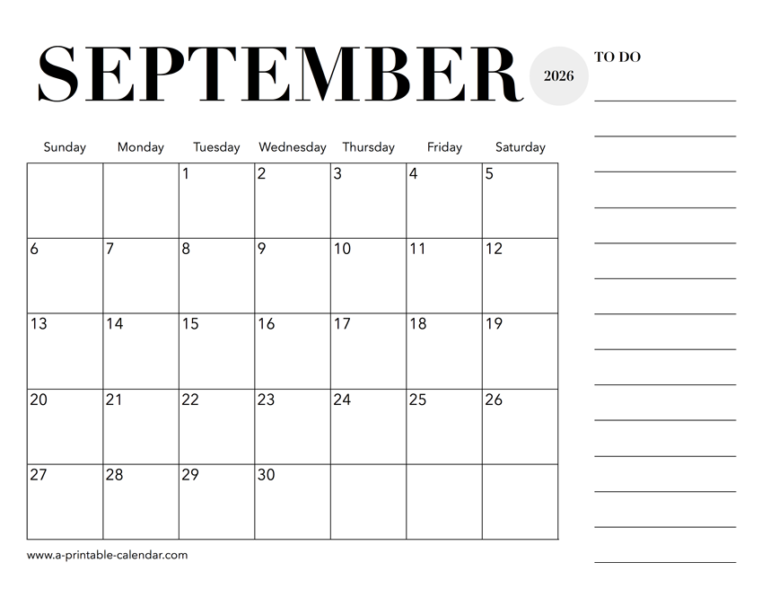 Download this 2026 calendar for September that comes with a handy to do list on the right side. You can also use that space for notes or to mark other events. Paper size: US Letter. Dimensions: 8.5 x 11 inch. Orientation: landscape, horizontal.
