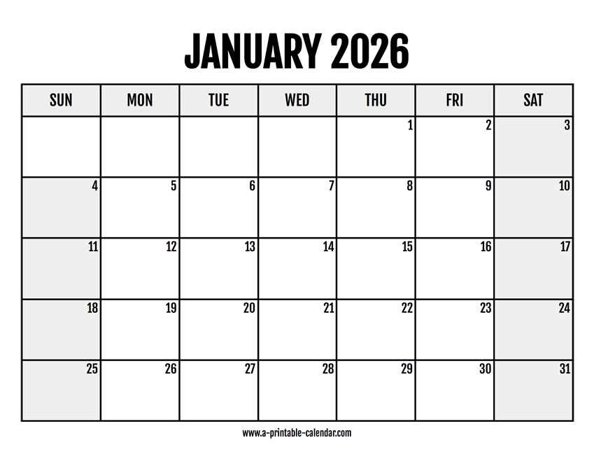 Download this 2026 January calendar in printable PDF format. The weekend is highlighted, which means Sunday and Saturday are easier to spot at a first glance. Paper size: US Letter. Dimensions: 8.5 x 11 inch. Orientation: landscape, horizontal.