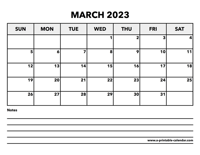 Download this calendar for March 2023 that has a handy space for notes at the bottom. This section can also be used for to-dos or writing down other information. Paper size: US Letter. Dimensions: 8.5 x 11 inch. Orientation: landscape, horizontal.