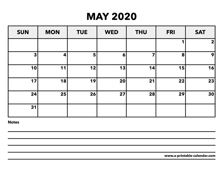 Download this calendar for May 2020 that has a handy space for notes at the bottom. This section can also be used for to-dos or writing down other information. Paper size: US Letter. Dimensions: 8.5 x 11 inch. Orientation: landscape, horizontal.