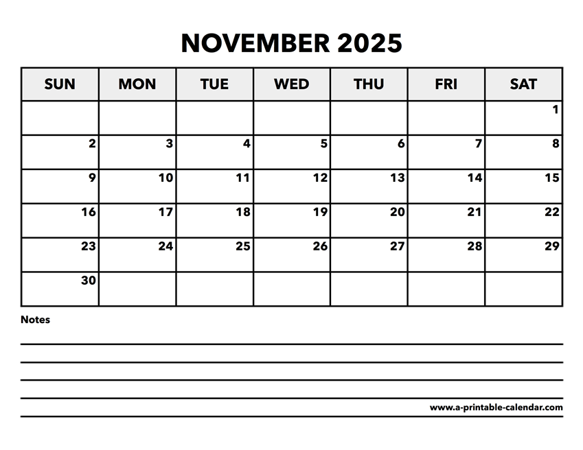 Download this calendar for November 2025 that has a handy space for notes at the bottom. This section can also be used for to-dos or writing down other information. Paper size: US Letter. Dimensions: 8.5 x 11 inch. Orientation: landscape, horizontal.