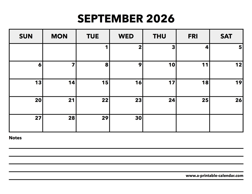Download this calendar for September 2026 that has a handy space for notes at the bottom. This section can also be used for to-dos or writing down other information. Paper size: US Letter. Dimensions: 8.5 x 11 inch. Orientation: landscape, horizontal.