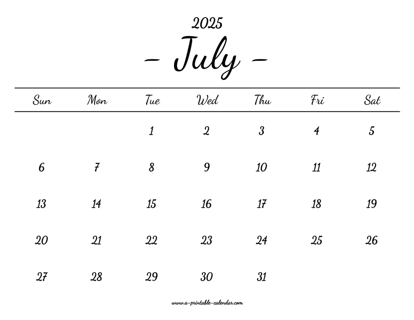 Download this July calendar for 2025 with lovely typography and in a printable PDF format. Paper size: US Letter. Dimensions: 8.5 x 11 inch. Orientation: landscape, horizontal.