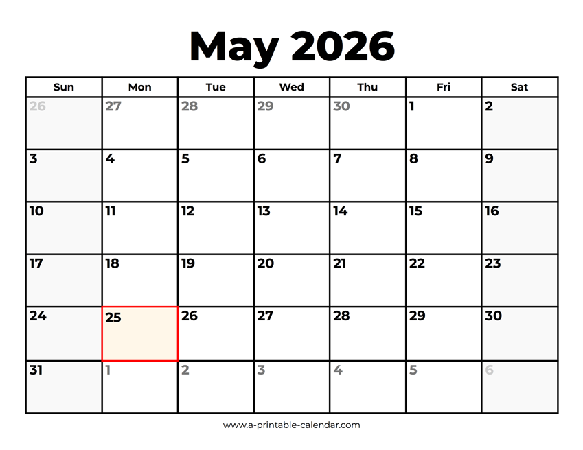 Download this 2026 May calendar with holidays in case you’re looking for a simple printable PDF. In May there is one official holiday in the U.S. - Memorial Day, on the 25th of the month. Paper size: US Letter. Dimensions: 8.5 x 11 inch. Orientation: landscape, horizontal.