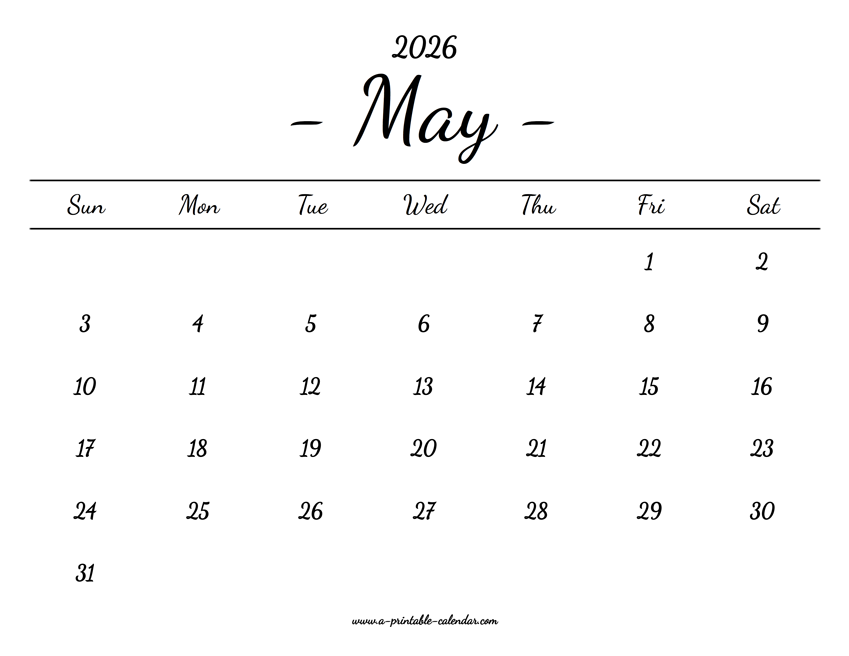 Download this May calendar for 2026 with lovely typography and in a printable PDF format. Paper size: US Letter. Dimensions: 8.5 x 11 inch. Orientation: landscape, horizontal.