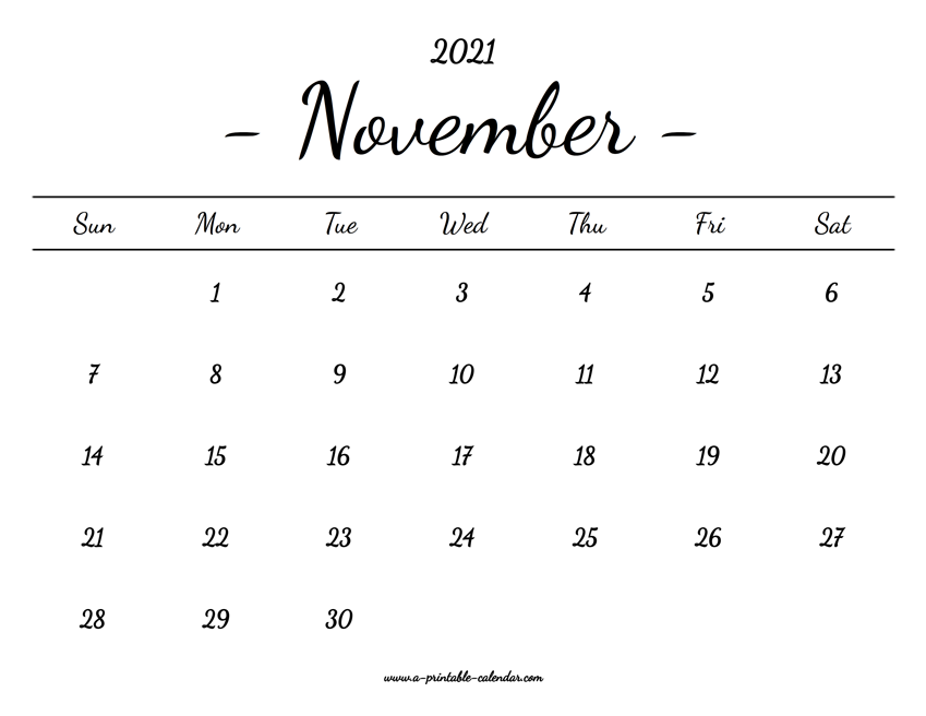 Download this November calendar for 2021 with lovely typography and in a printable PDF format. Paper size: US Letter. Dimensions: 8.5 x 11 inch. Orientation: landscape, horizontal.