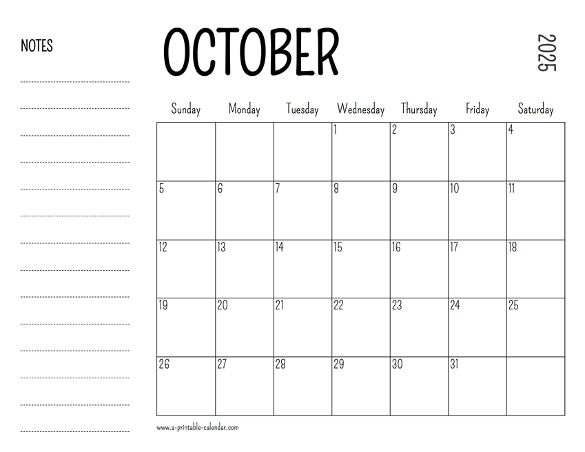 Download this October 2025 printable calendar that comes with a useful notes section on the left side. Besides notes, this space can be used for your to-dos or certain events. Paper size: US Letter. Dimensions: 8.5 x 11 inch. Orientation: landscape, horizontal.