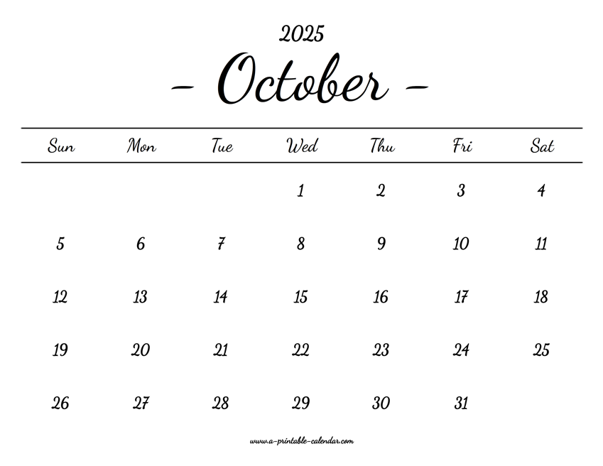 Download this October calendar for 2025 with lovely typography and in a printable PDF format. Paper size: US Letter. Dimensions: 8.5 x 11 inch. Orientation: landscape, horizontal.